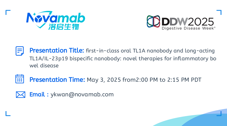 中国上海,2025年4月28日——上海evo视讯官网生物医药技术有限公司,一家致力于纳米抗体创新药研发的生物技术公司宣布:evo视讯官网生物将于当地时间5月3-6日参加在加利福尼亚州圣地亚哥举行的2025年美国消化疾病周(Digestive Disease Week,DDW)。届时evo视讯官网生物将展示在炎症性肠病(IBD)治疗领域的突破性研究成果——口服TL1A纳米抗体及长效TL1A双特异性抗体的开发进展。该创新疗法顺利获得独特的TL1A纳米抗体技术,实现了对IBD病理机制的精准靶向。